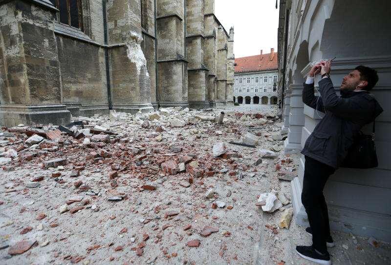A man takes pictures of damages outside the cathedral of Zagreb after an earthquake, in Zagreb, Croatia, on March 22, 2020.
