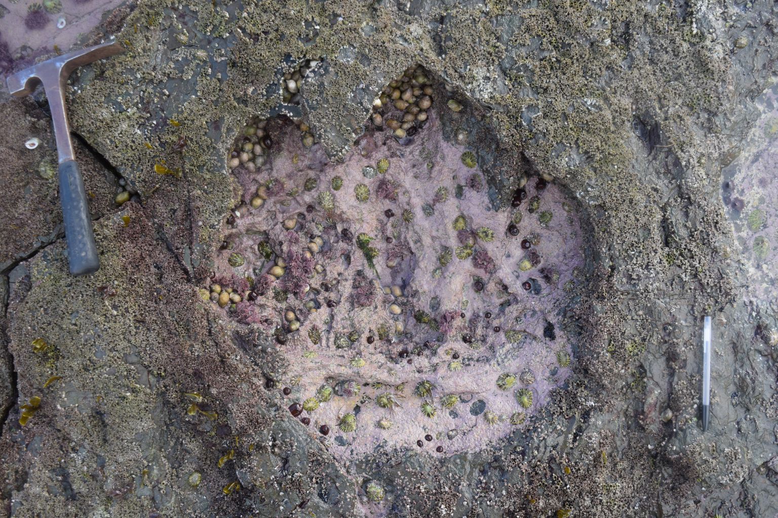 A sauropod footprint discovered at Brothers' Point on the Isle of Skye in Scotland.