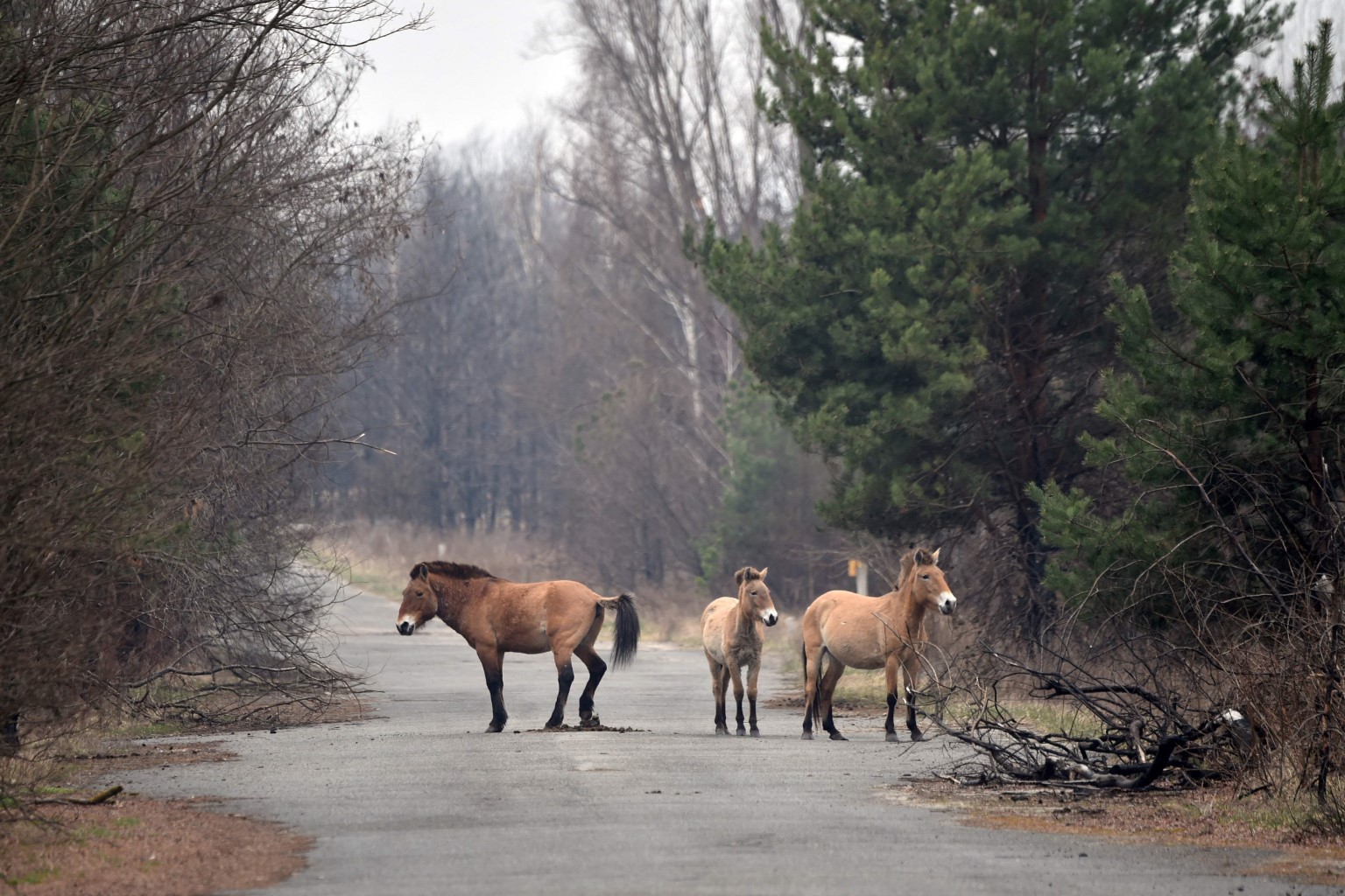 CHERNOBYL (UKRAINE) • Down an overgrown country road, three startled wild horses with rugged coats and rigid manes dart into the flourishing overgrowth of their unlikely nature reserve: the Chernobyl exclusion zone.