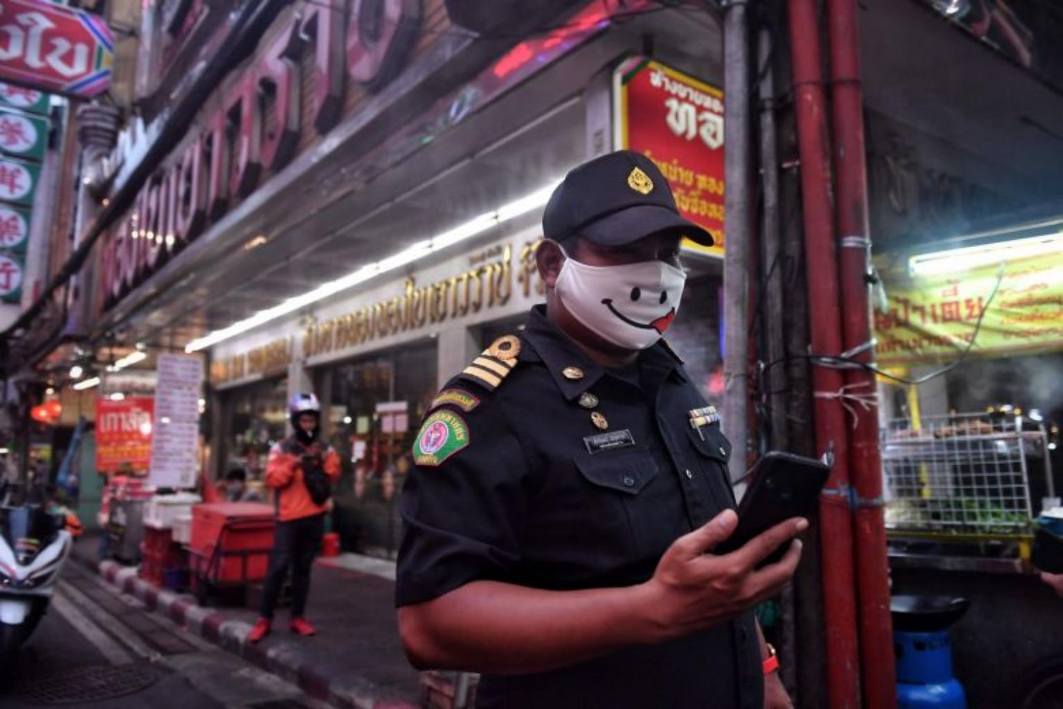 A policeman in a mask patrols Chinatown in Bangkok on April 17, 2020.