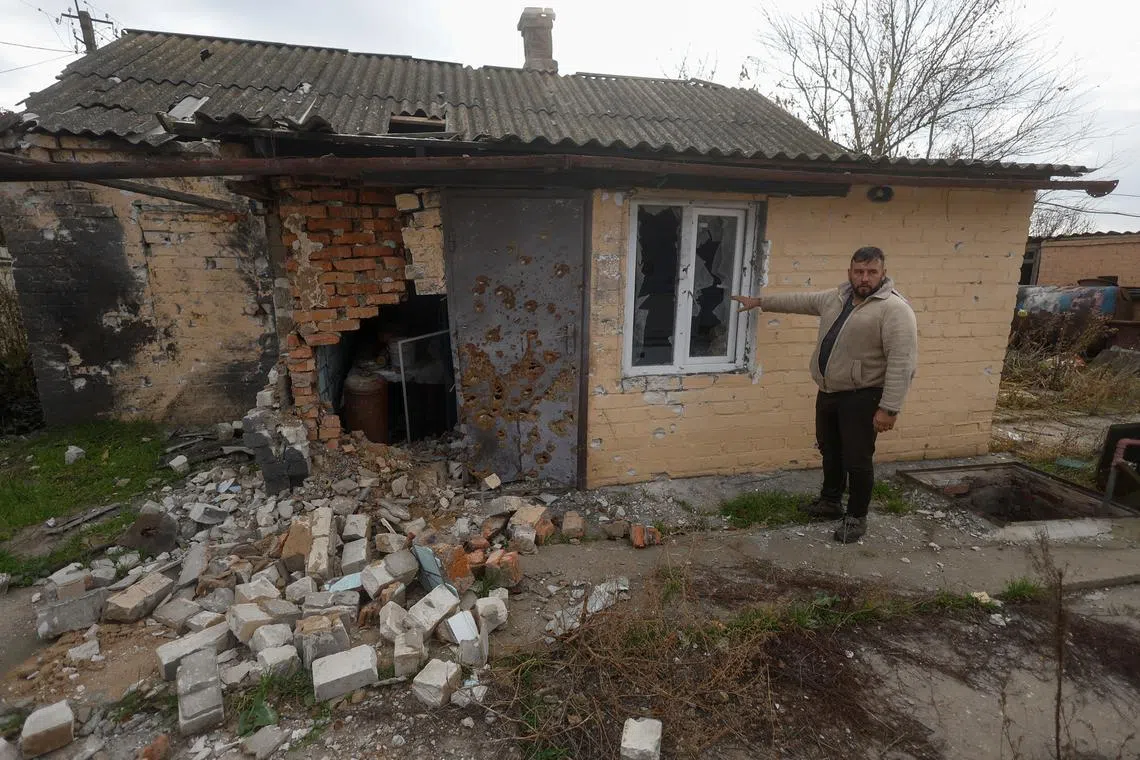 A building damaged by a military strike in the village of Blahodatne in Kherson region on Nov 11, 2022.