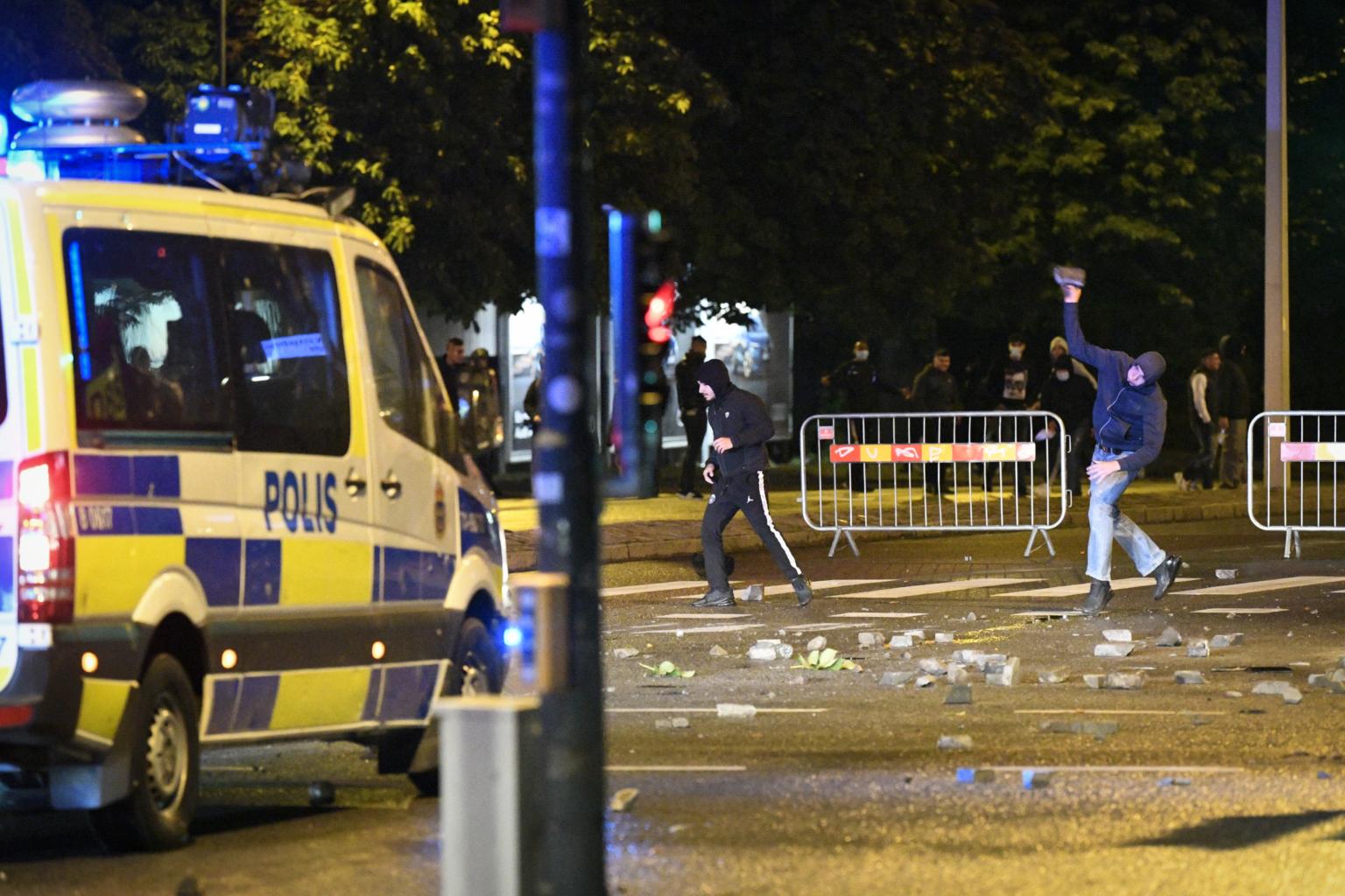 Demonstrators throw stones at police as protesters riot in the Rosengard, Sweden, on Aug 28, 2020.