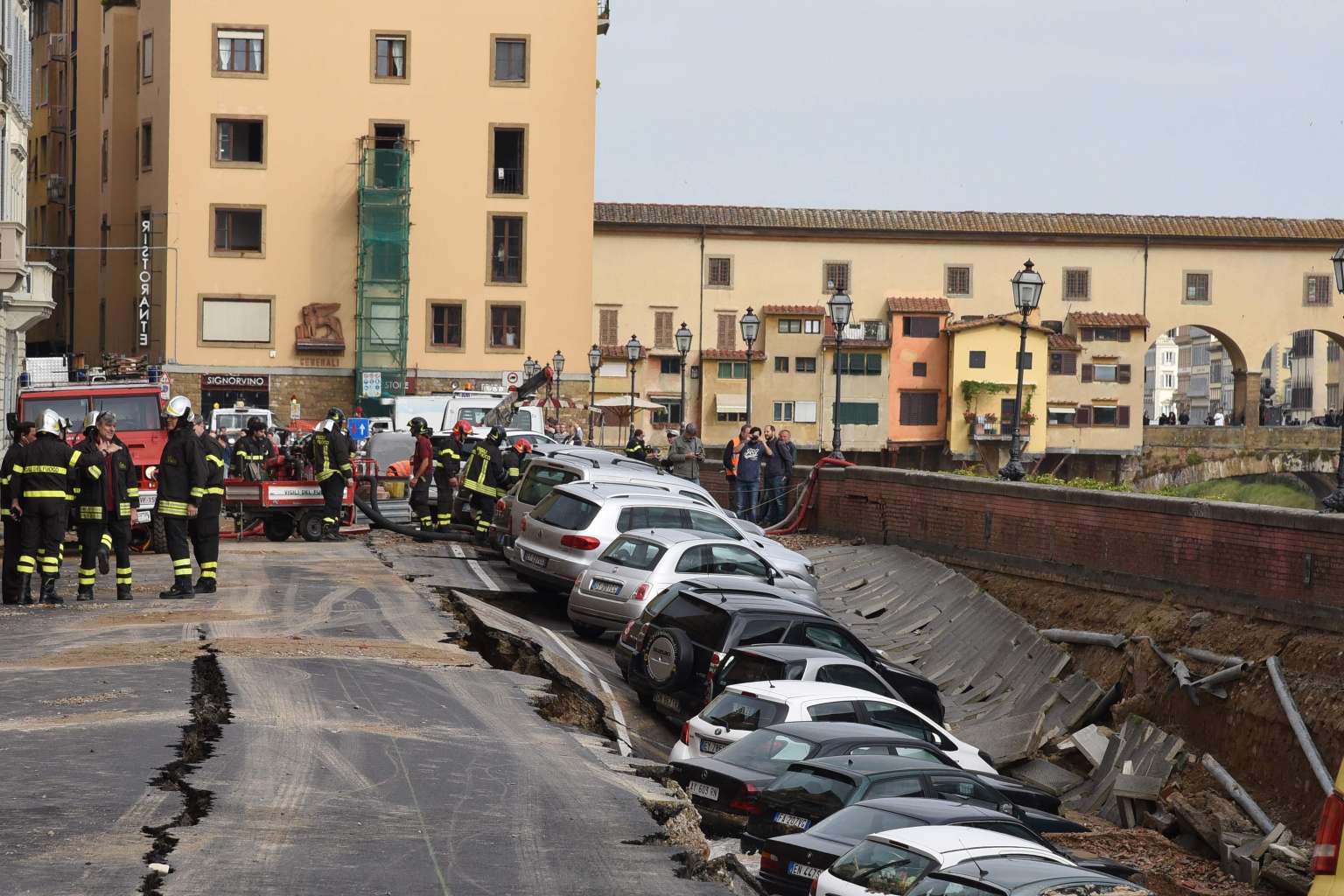 The stretch of road between the 14th century Ponte Vecchio and the Ponte alle Grazie caved in when a mains pipe it was sitting on burst in the early hours of the morning, dropping around 15 cars into a depression which filled with water.