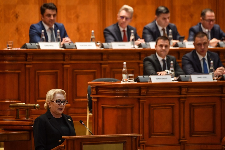 Romanian Prime Minister Viorica Dancila delivers her speech during a Parliament session called to debate and vote a non-confidence motion on the Romanian Government at the Parliament Palace in Bucharest on Oct 10, 2019.