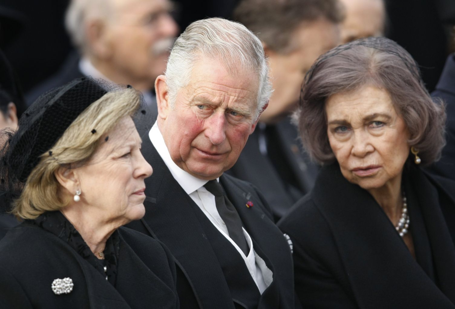 Queen Ann-Marie of Greece (left), Britain's Prince Charles of Wales (centre) and Queen Sofia of Spain attend the funeral ceremony of late King Michael I of Romania.