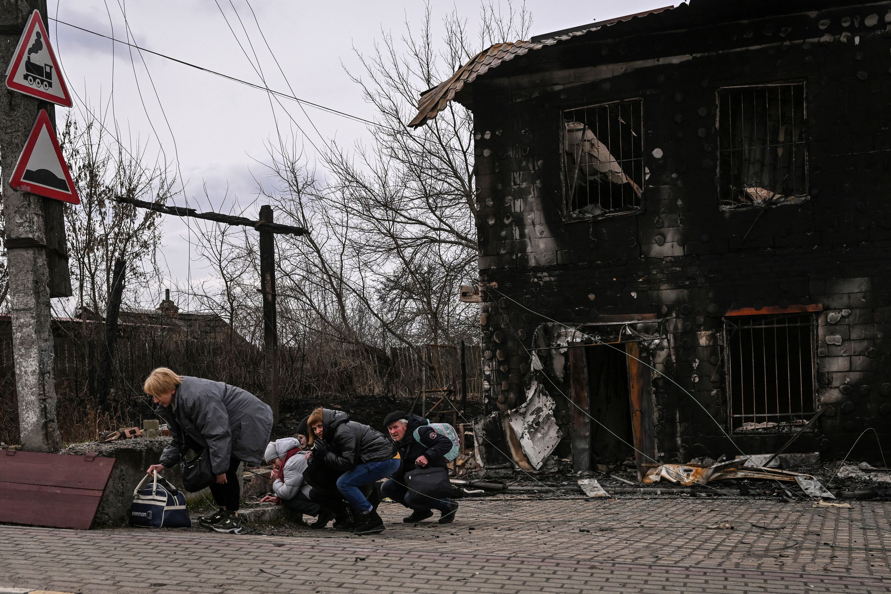 People take cover from shelling in the city of Bucha, west of Kyiv, on March 4, 2022.