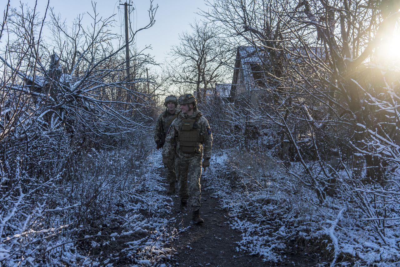 Ukrainian soldiers on patrol in Adviivka, eastern Ukraine, on Dec 2, 2021.