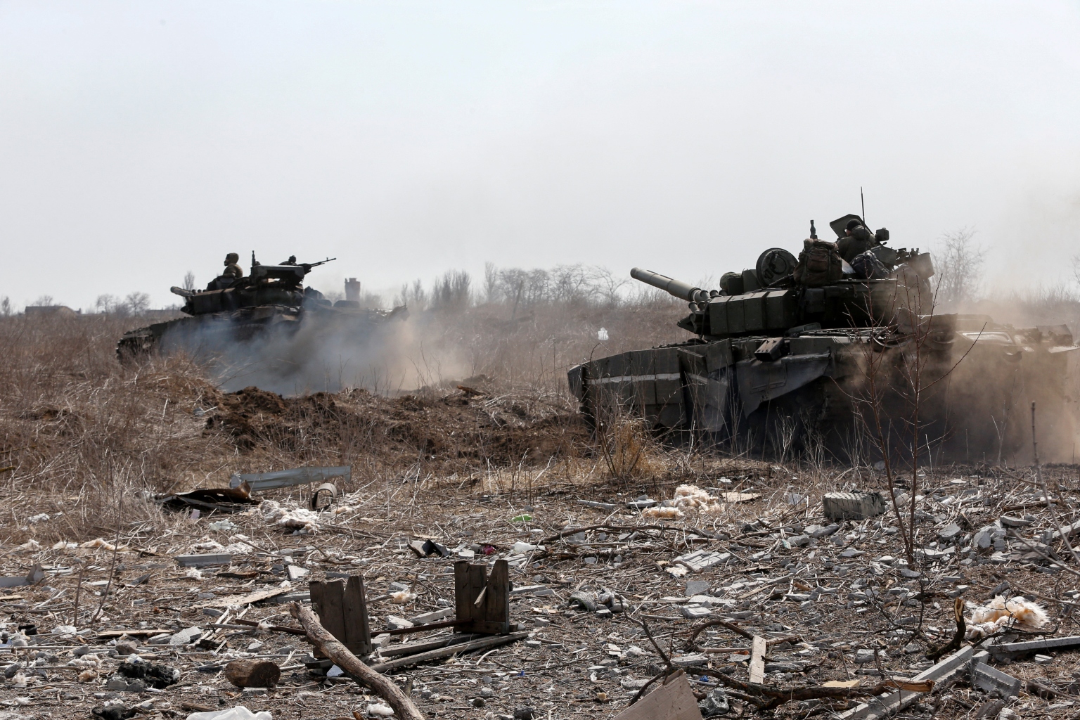 Service members of pro-Russian troops are seen atop of tanks on the outskirts of Mariupol on March 20, 2022.