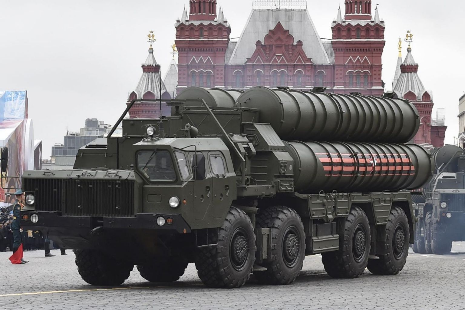 Russian S-400 Triumph medium-range and long-range surface-to-air missile systems riding through Red Square during the Victory Day military parade in Moscow on May 9, 2017.