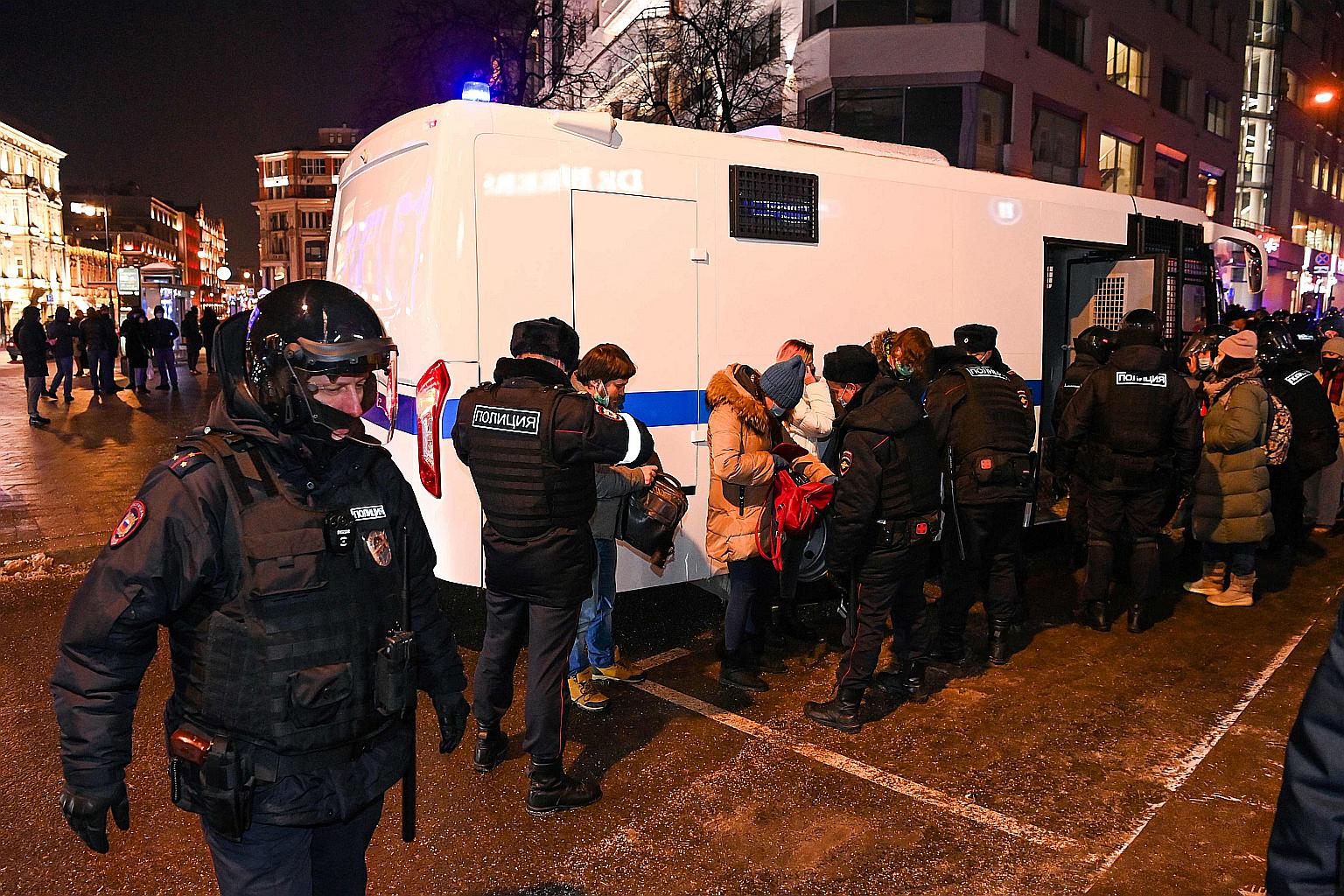 Police detain people during a protest in downtown Moscow, on Feb 2, 2021.