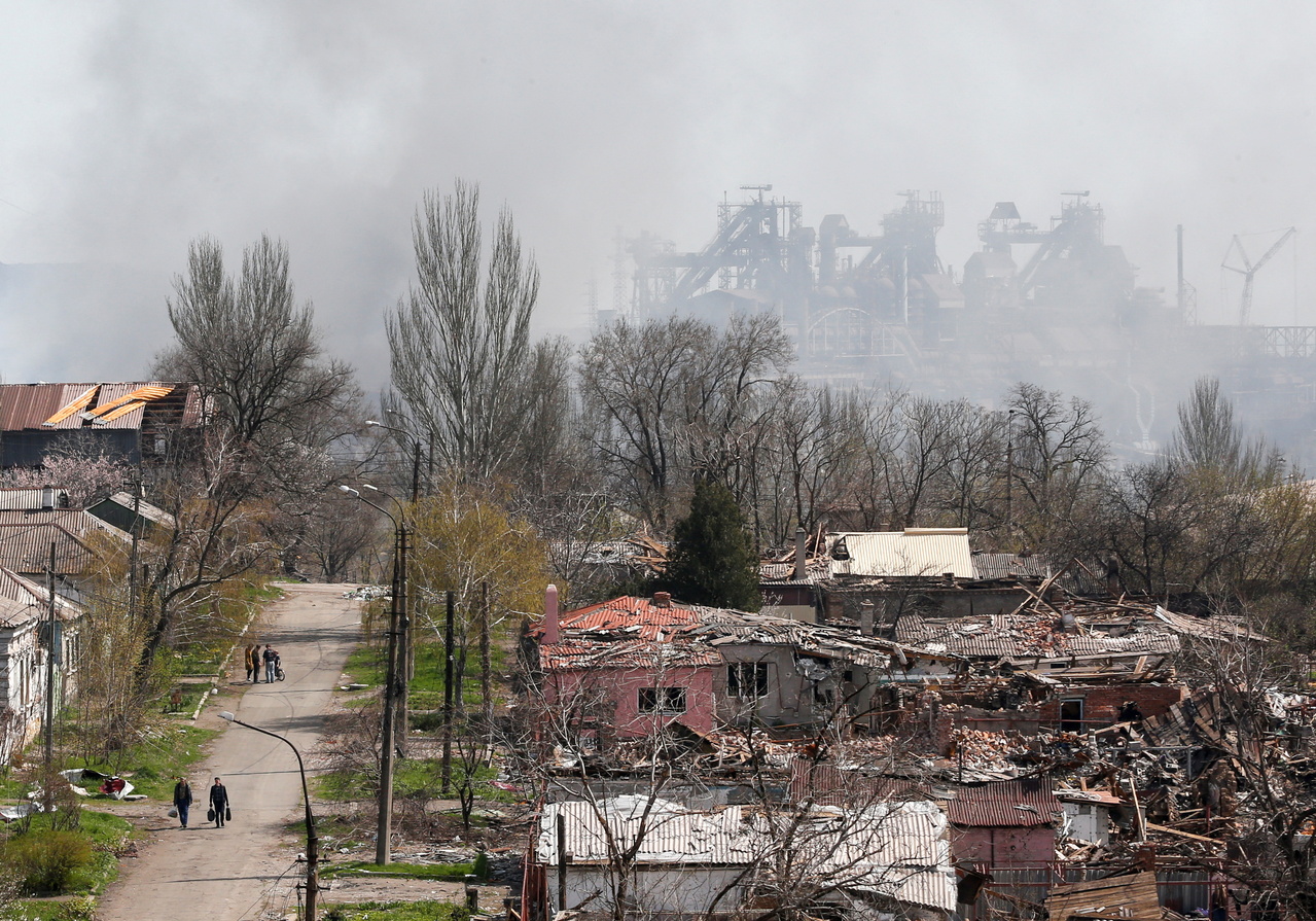Smoke rises above a plant of Azovstal Iron and Steel Works company in Mariupol, Ukraine, on April 18, 2022.