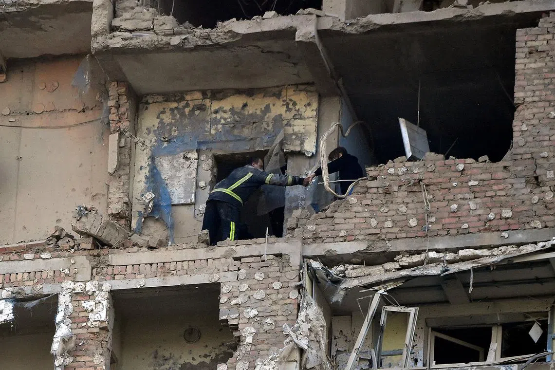 A rescuer evacuating a local resident woman from a multi-storey residential building partially destroyed after night drone attacks in Kyiv, on May 30, 2023.