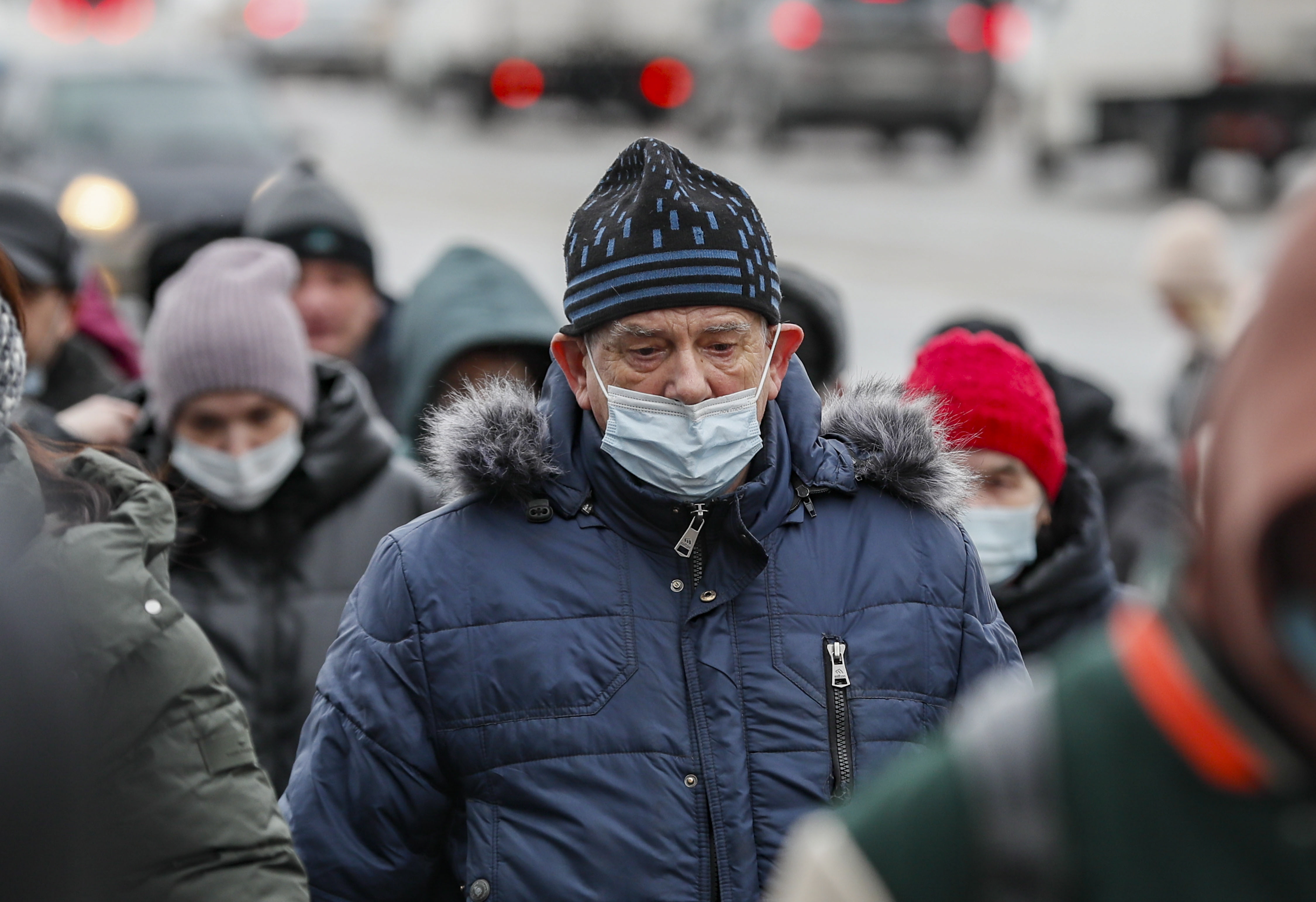 People wearing protective face masks walk on a street in Moscow, Russia, on Jan 27, 2022.