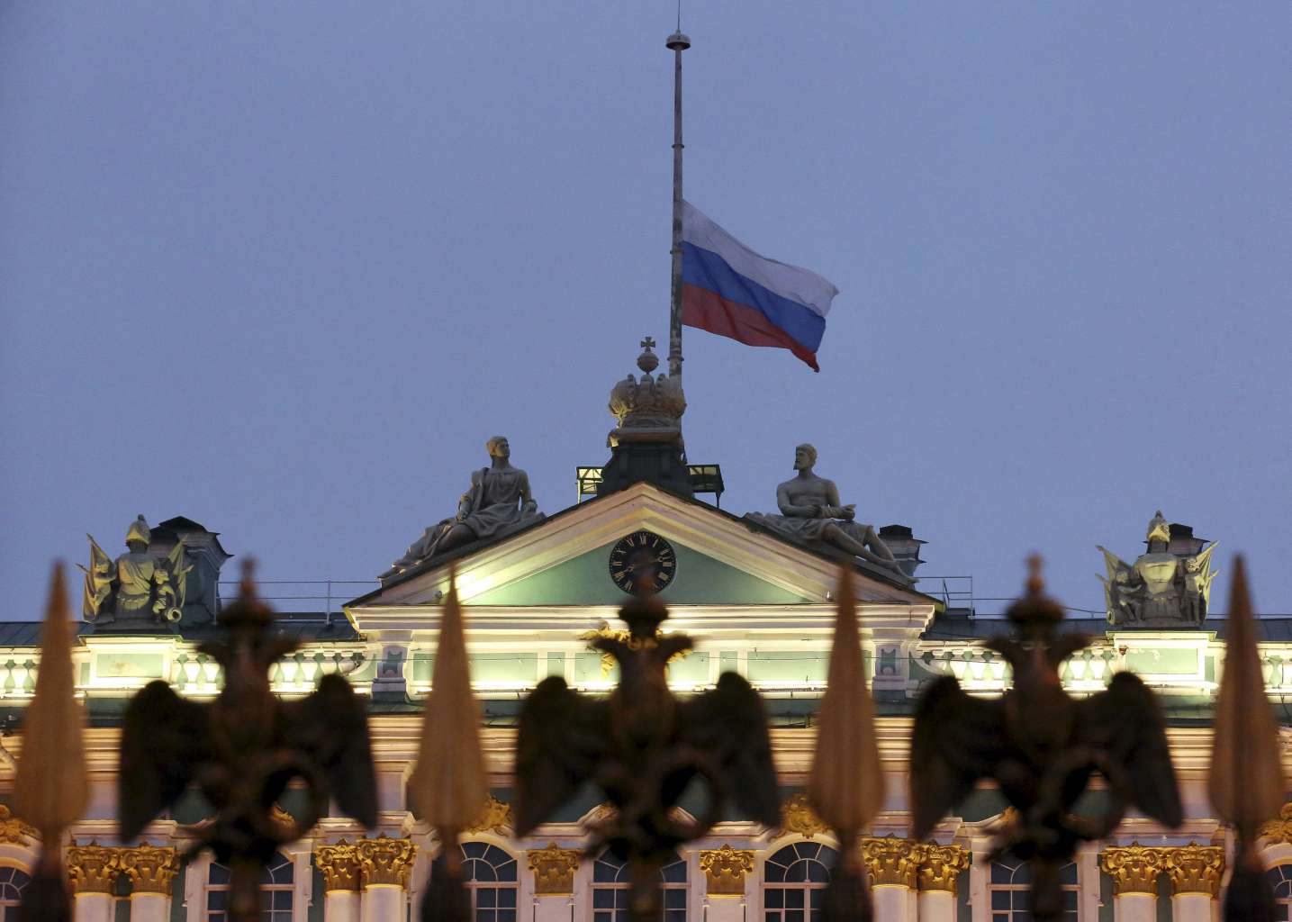 The Russian national flag flies at half-mast on the roof of the State Hermitage Museum in St Petersburg, Russia on Nov 1, 2015.