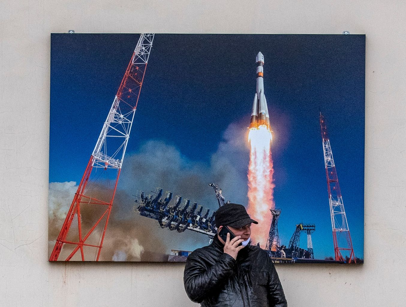 A man speaks on his phone near a picture of the Russian Soyuz spacecraft blasting off, in central Moscow, June 2, 2020.