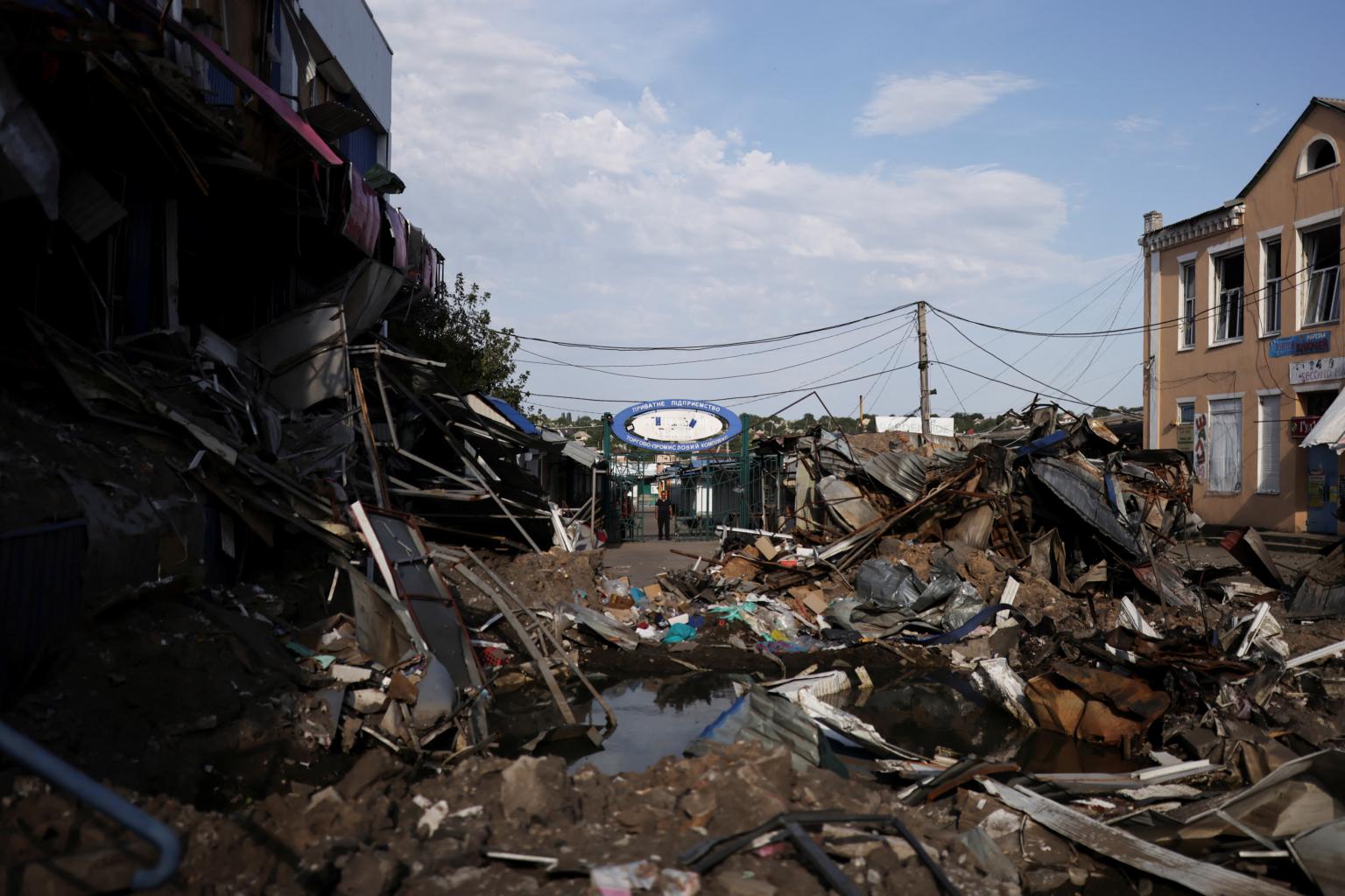 A destroyed street market in Bakhmut after a military strike in Donetsk region, Ukraine, on Aug 14, 2022.