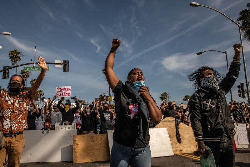 People are seen at a protest over the death of George Floyd in Santa Monica, California, on May 31, 2020.