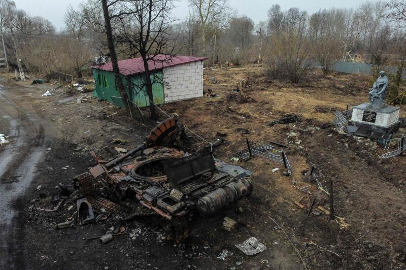 A destroyed Russian tank is seen in the village of Lukianivka, on March 30, 2022.