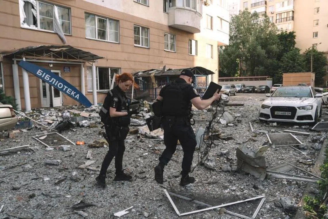 Police officers inspect the site of a Russian overnight attack in Kyiv, Ukraine, on June 6.