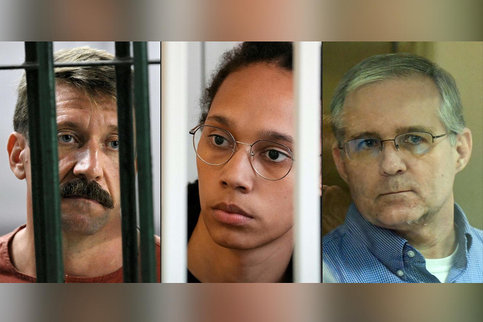 (From left) Russian arms dealer Viktor Bout and Americans Brittney Griner, a basketball star, and Mr Paul Whelan, a former US Marine.
