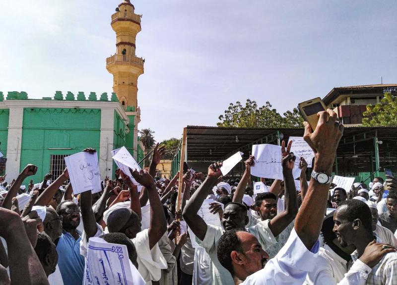 Protesters chant slogans and raise signs against President Omar al-Bashir during a demonstration in Khartoum's twin city of Omdurman, Sudan, on Jan 25, 2019.