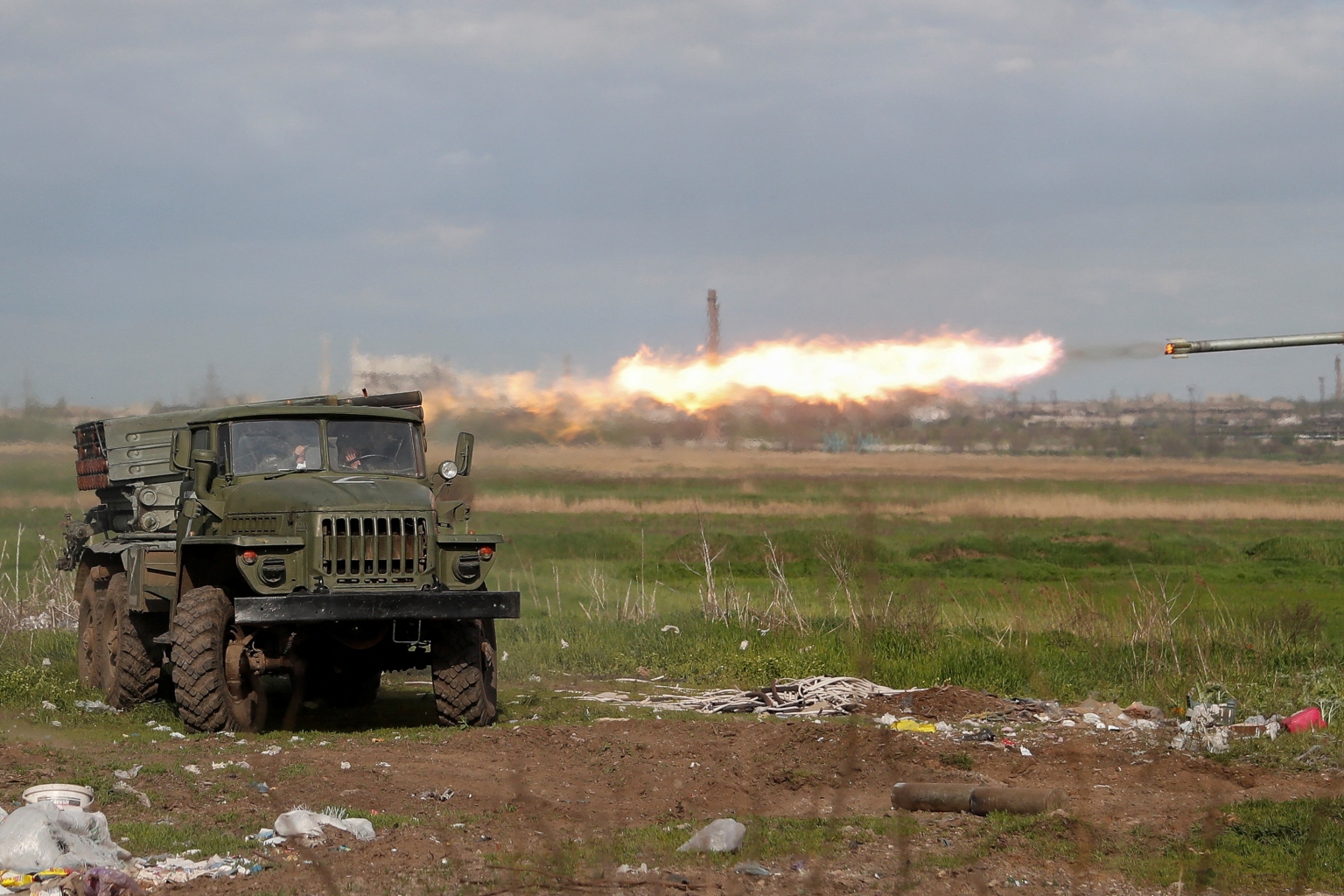 Service members of pro-Russian troops fire a BM-21 Grad multiple rocket launch system in Mariupol on May 2, 2022.
