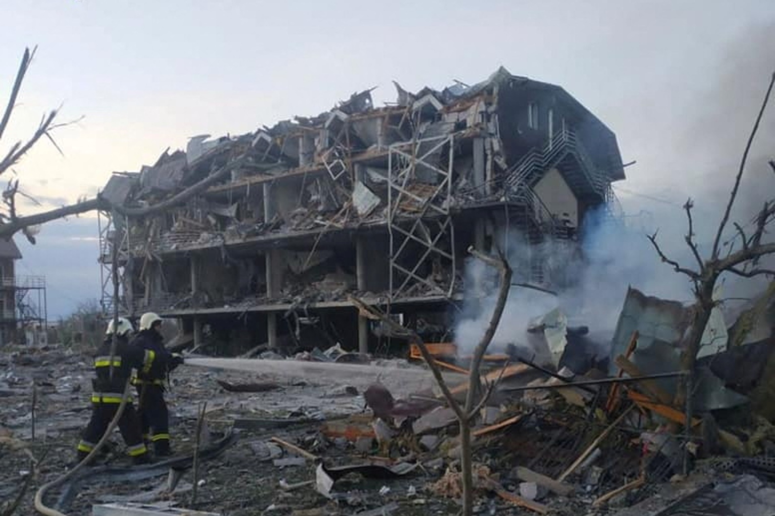 Emergency personnel near a building damaged after a military strike, in Odesa, Ukraine, on May 9, 2022.