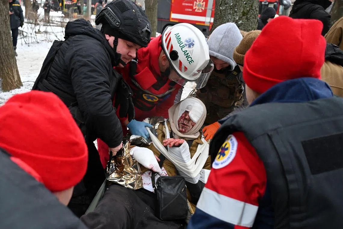 Rescuers evacuating a resident from a building heavily damaged during a Russian missile attack, in Kharkiv, Ukraine, on Jan 23.