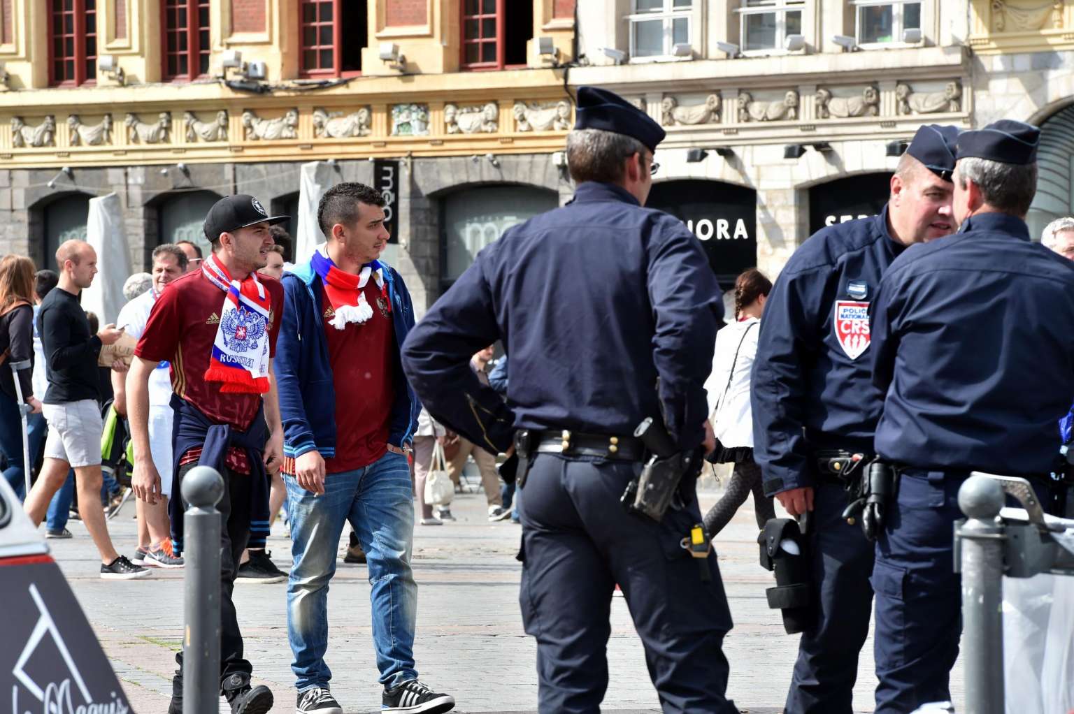 Russian fans (left) walk past police officer as they wander in downtown Lille, northern France, on June 15, 2016.