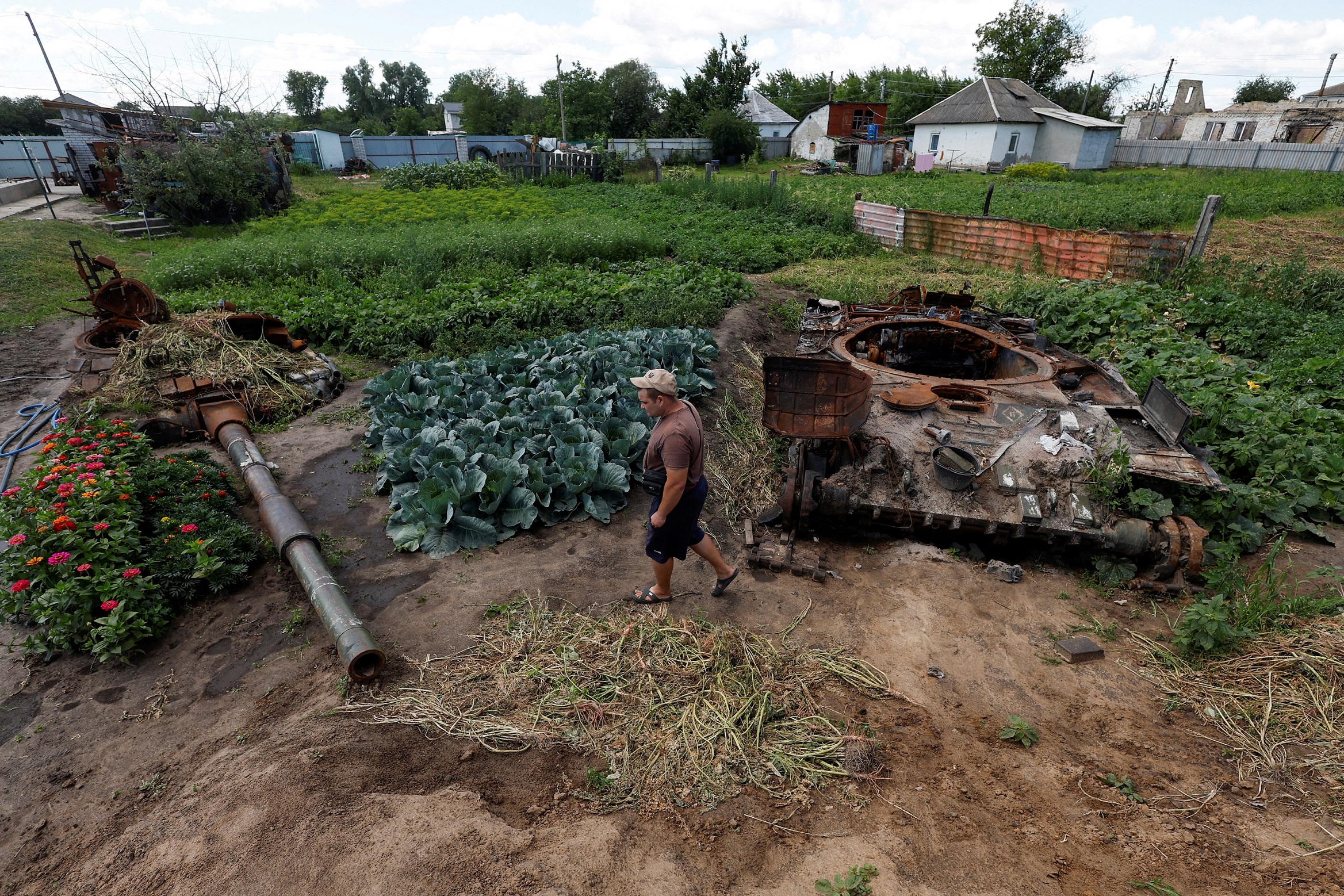 A local resident walks past a destroyed Russian tank in his garden, in the village of Velyka Dymerka, in Ukraine's Kyiv region, on July 22, 2022.