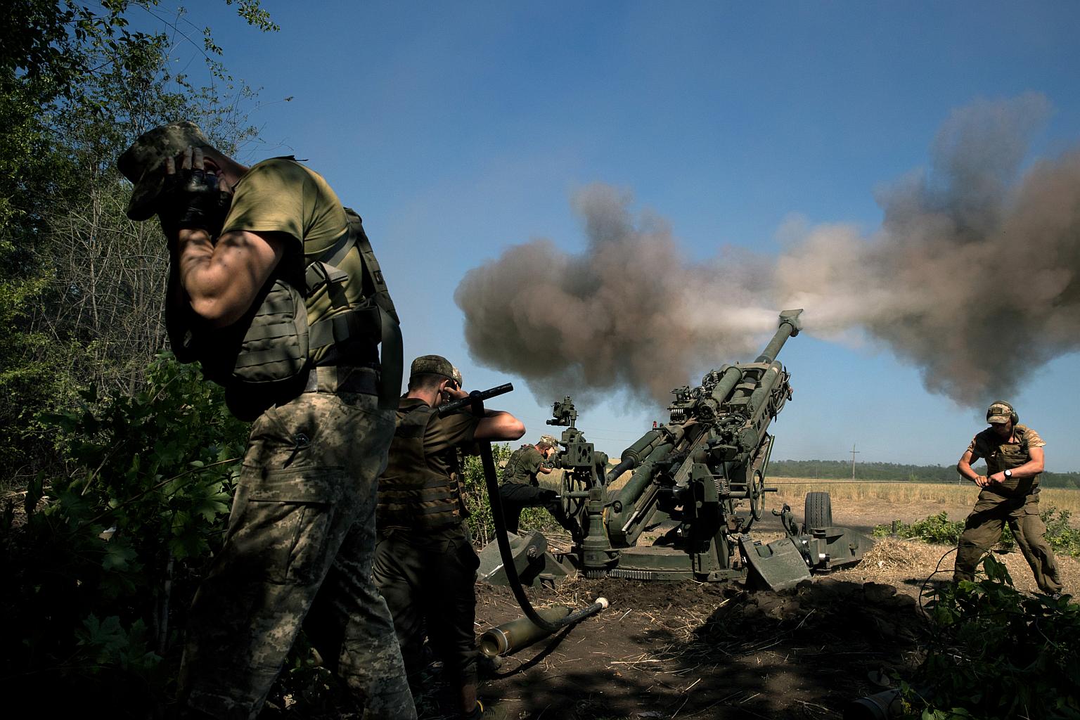 Ukrainian soldiers fire a US-supplied M777 howitzer at Russian positions in the Donetsk region on June 21, 2022.