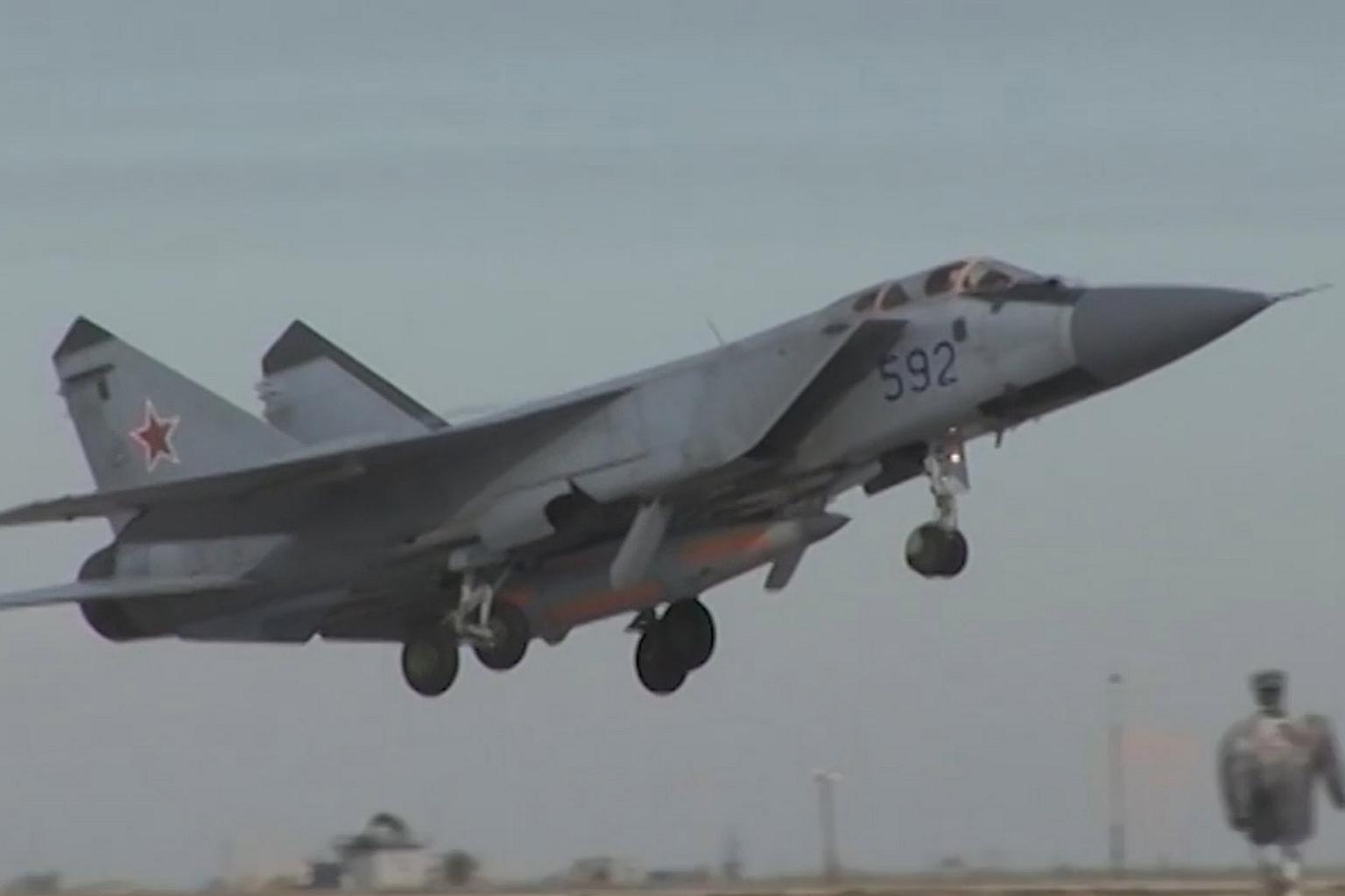 A Russian MiG-31 carrying the new Kinzhal hypersonic missile, as seen in a screen grab from an official video released by the Kremlin.