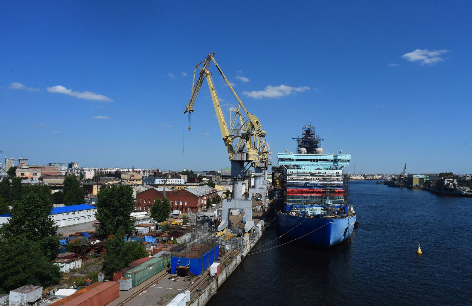 A July 2021 photo shows Russia's nuclear-powered icebreaker Sibir during construction at the Baltic Shipyard in Saint-Petersburg.