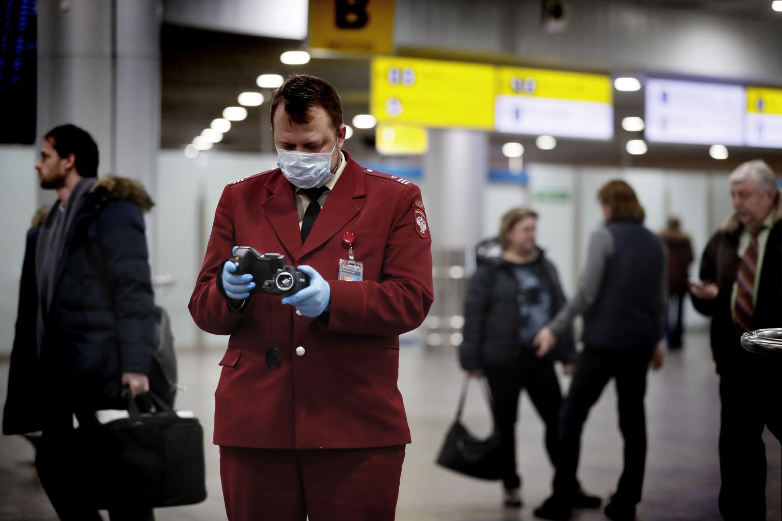 An official of Russian Quarantine Service of Rospotrebnadzor using a thermal-imaging device to remotely measure the temperature of passengers at the Sheremetyevo airport in Moscow on Jan 30, 2020.