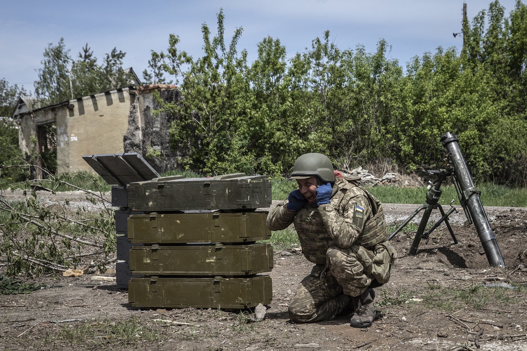 A Ukrainian soldier with a mortar team in the village of Pytomnyk, outside Kharkiv, fires on a Russian position 3km away.