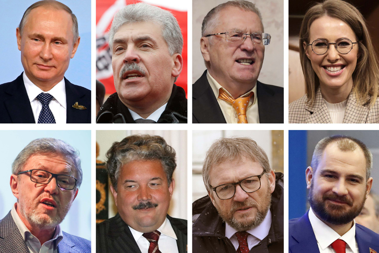 A combination picture shows candidates in the Russian 2018 presidential election: (clockwise from top left) Vladimir Putin, Pavel Grudinin, Vladimir Zhirinovsky, Ksenia Sobchak, Maxim Suraikin, Boris Titov, Sergei Baburin and Grigory Yavlinsky.