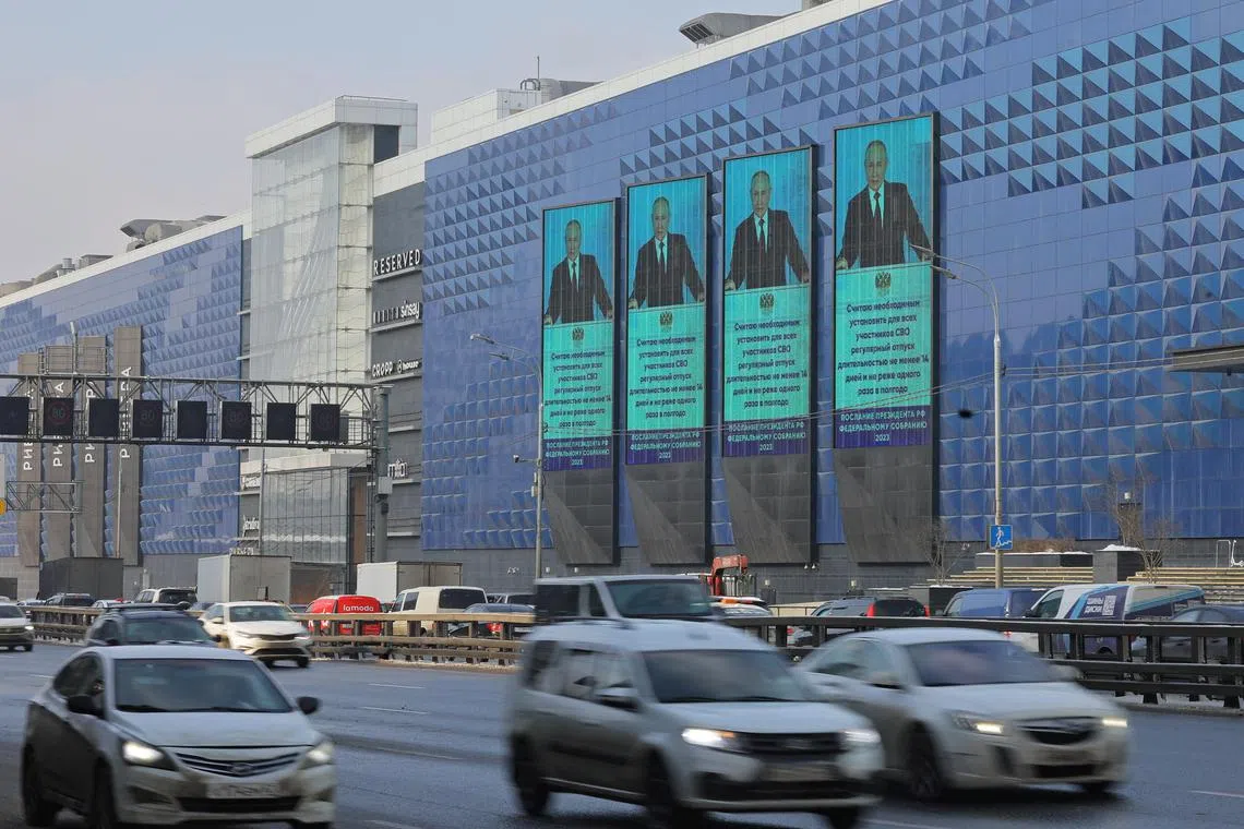 People gather for Mr Vladimir Putin’s address to the Federal Assembly at the Gostiny Dvor conference centre in Moscow, on Feb 21.