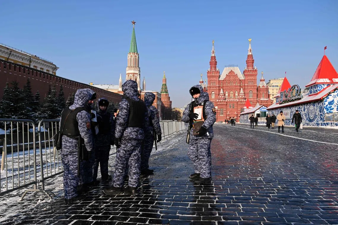 Russian National Guard officers patrol on Red Square prior to Mr Putin's annual state address, in central Moscow, on Feb 21.
