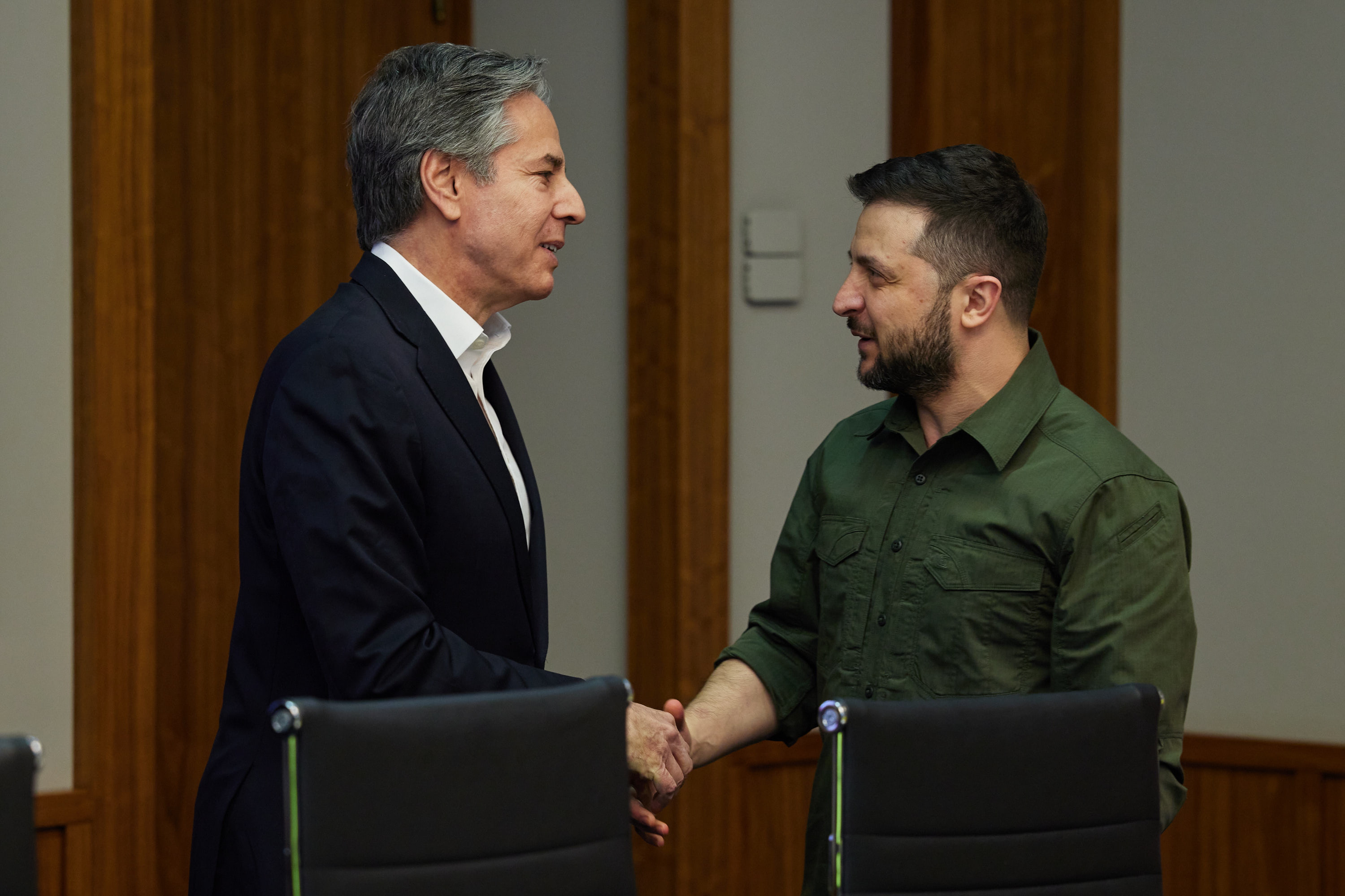 US Secretary of State Antony Blinken with Ukrainian President Volodymyr Zelensky in Kyiv on April 24, 2022.