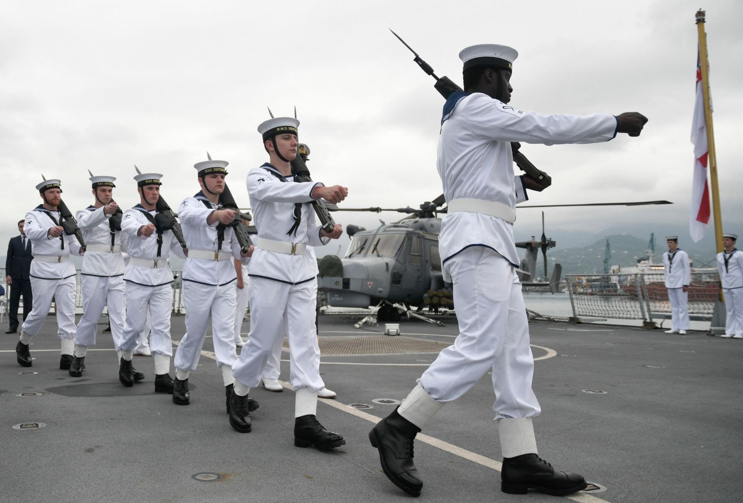 British Royal Navy sailors march aboard the warship HMS Defender in the Black Sea port of Batumi on June 26, 2021.