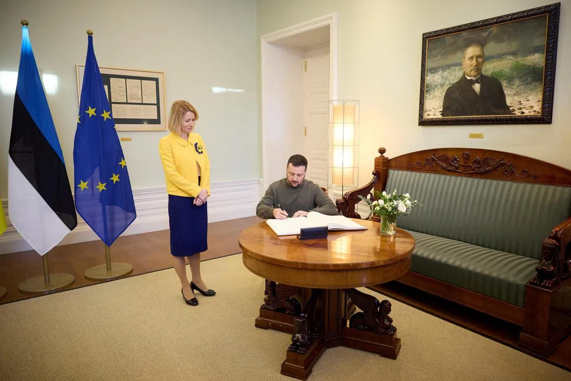 Ukrainian President Volodymyr Zelensky signs a guest book during a visit to Tallinn in January 2024, watched by Estonian Prime Minister Kaja Kallas.