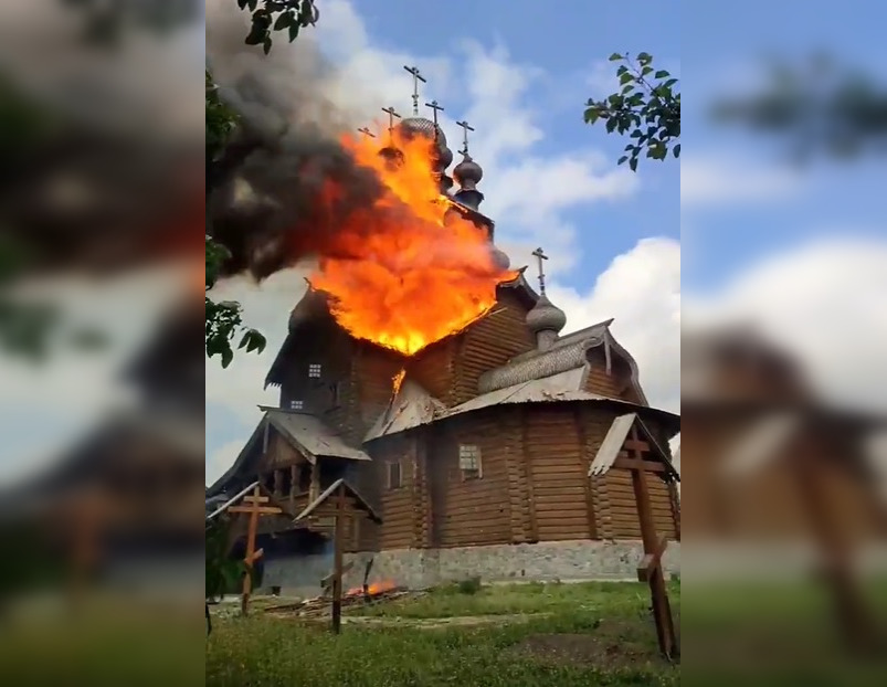Flames could be seen ripping through the timber walls of a church with onion domes in footage posted by Zelensky on his official Telegram channel.