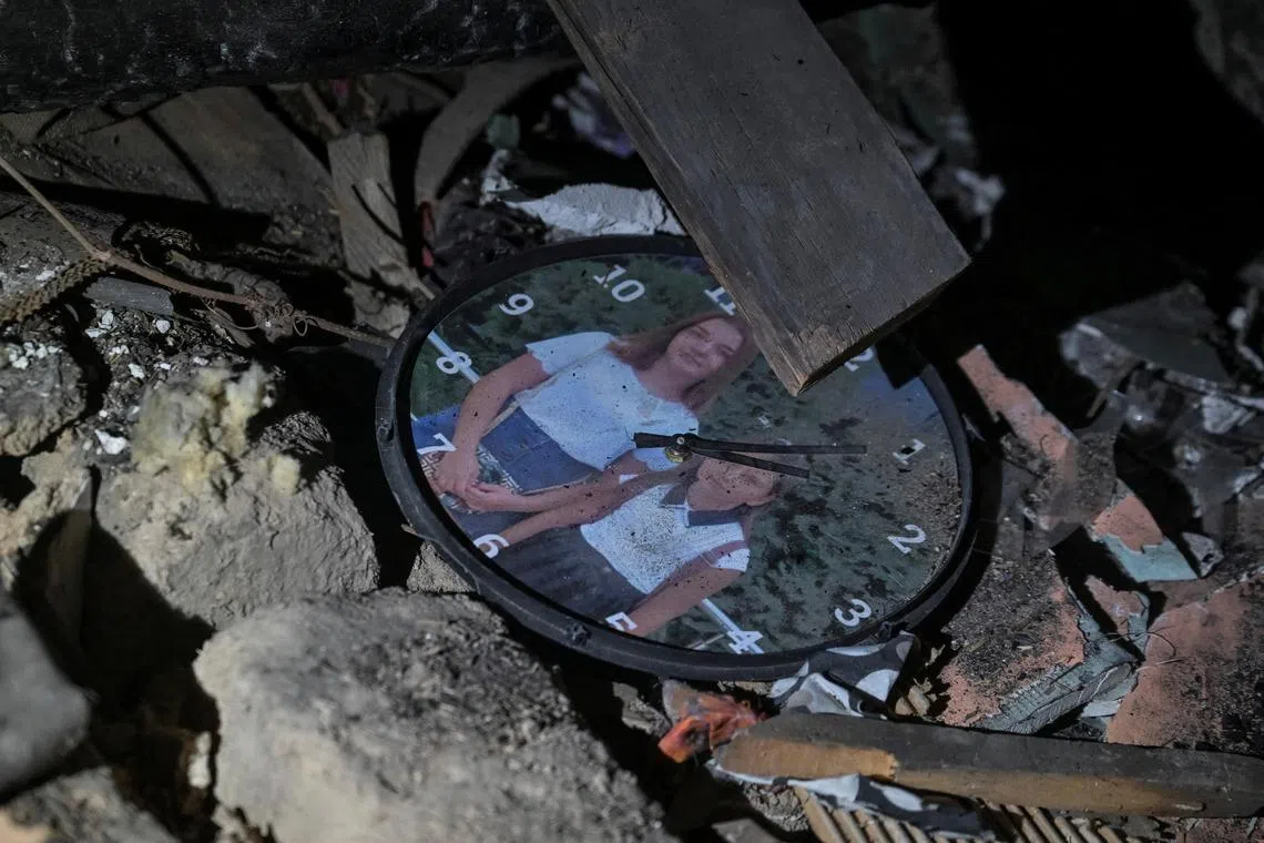 A wall clock with a picture of residents is seen at the site of a building hit by a Russian drone strike in Zaporizhzhia, on March 21.