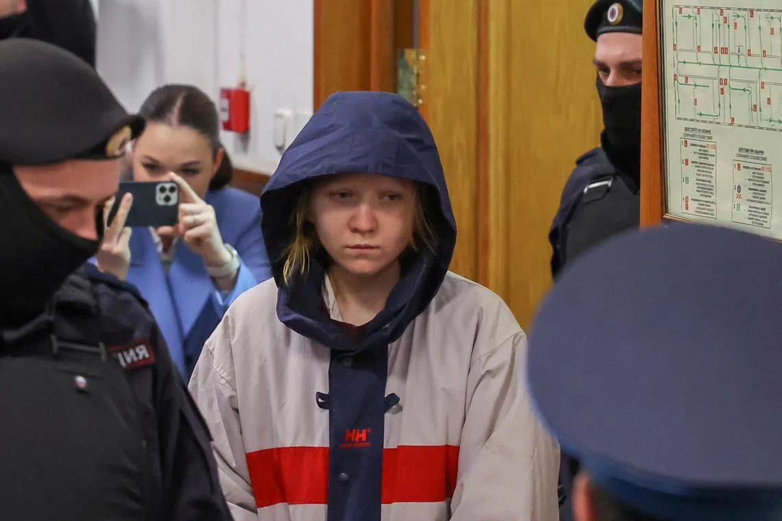 Darya Trepova being escorted into the Moscow court building for her hearing.