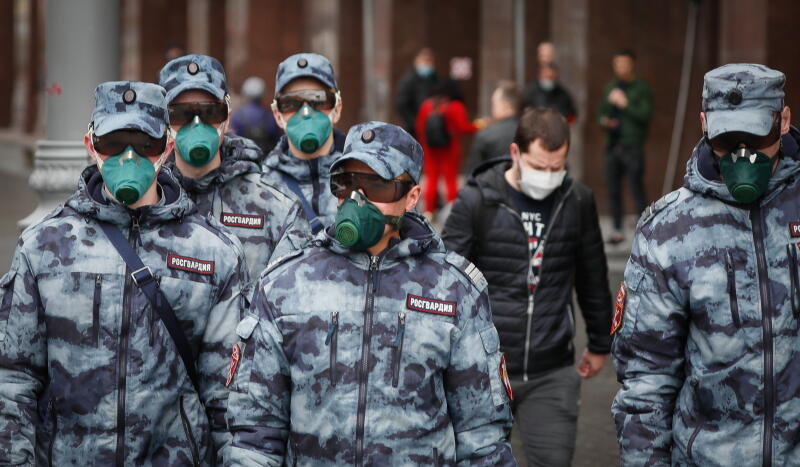 Russian National Guards wearing protective masks while patrolling Moscow's Red Square on May 9, 2020.