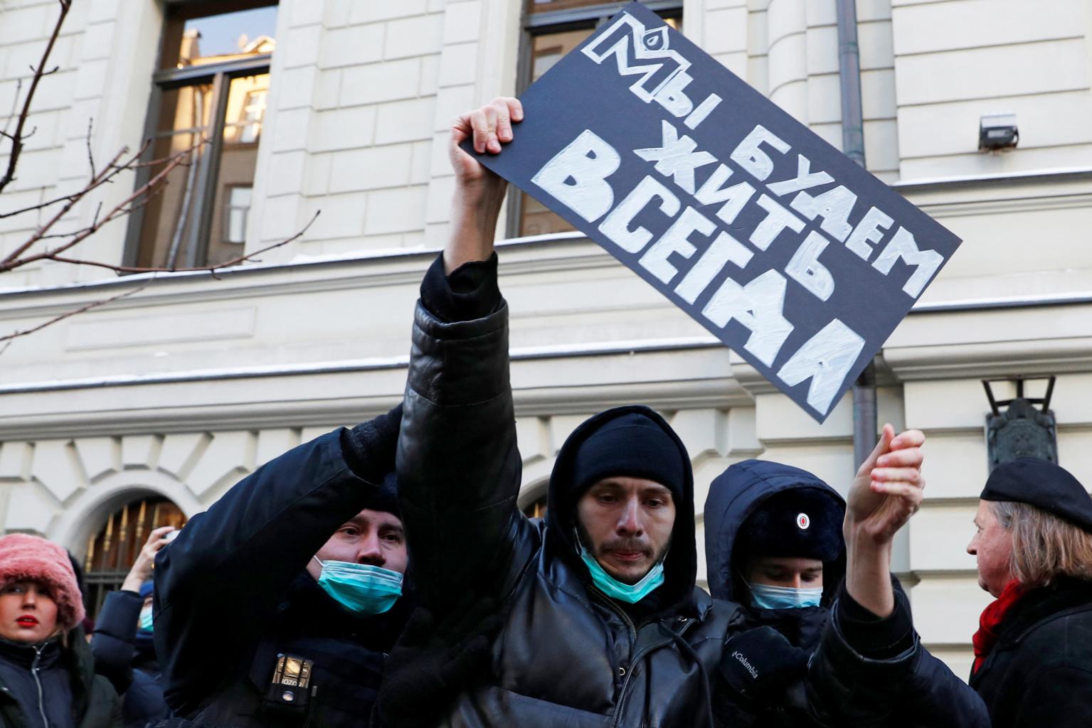 A Memorial supporter being restrained by police outside a court in Moscow on Dec 28, 2021.