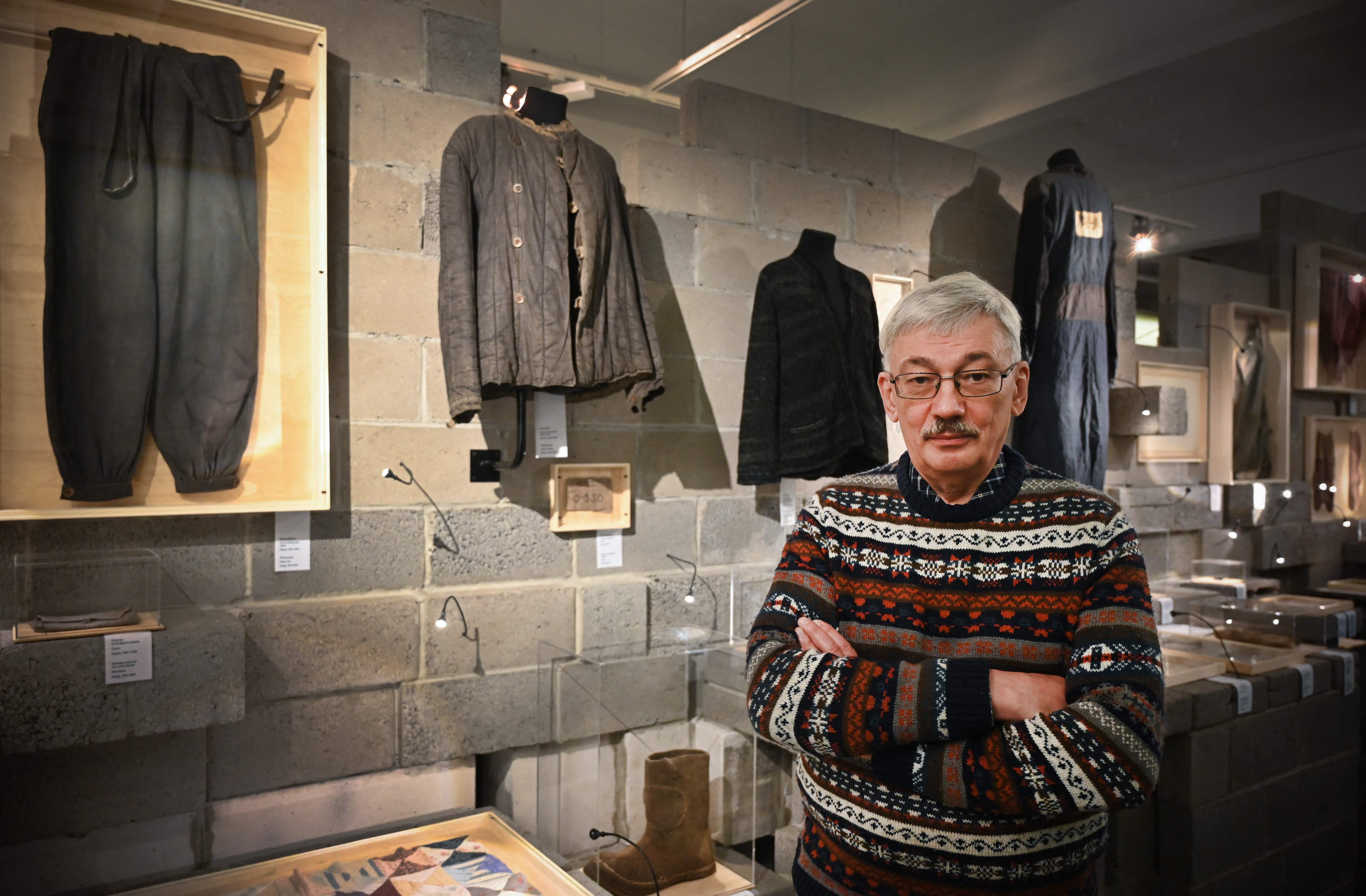 Memorial rights group board member Oleg Orlov poses at an exhibition devoted to political repressions at the group's office in Moscow.
