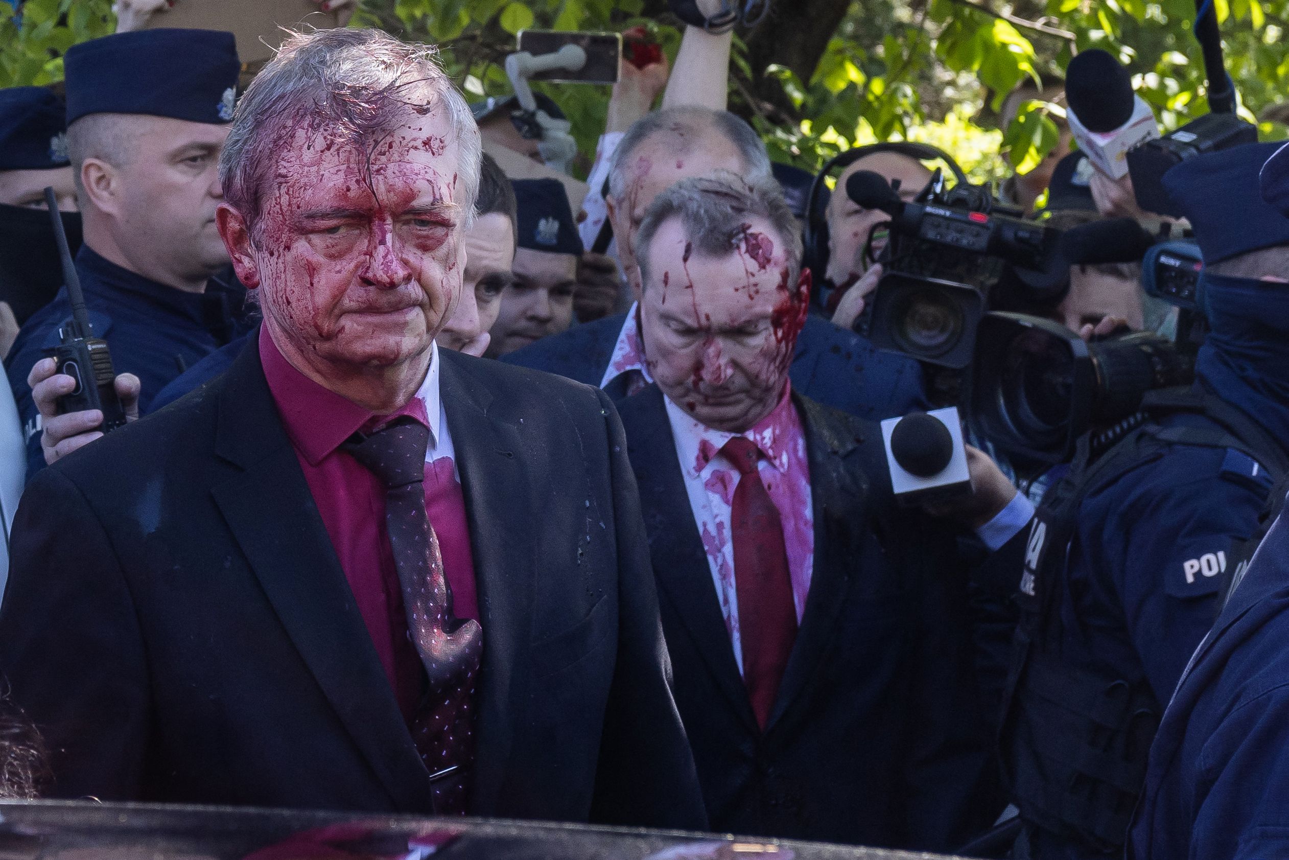 Several individuals then threw a red substance on his face and clothes, and also splattered some of the men in his entourage.