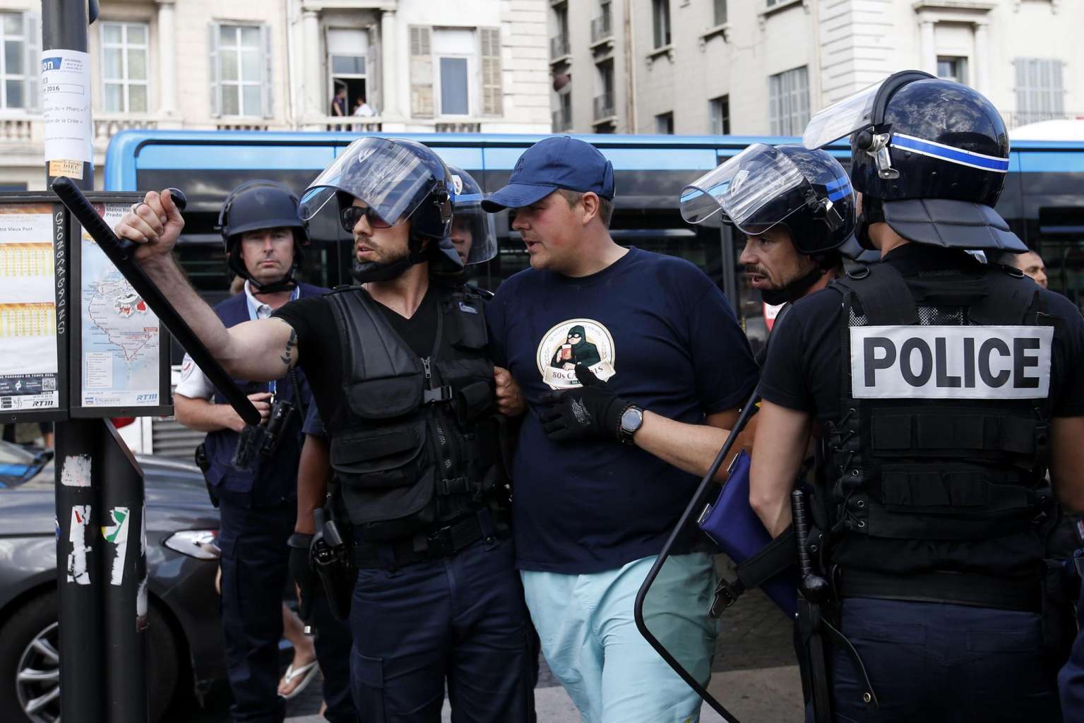 Riot police officers arrest a man after clashes bewteen English and Russian supporters at the Old Port of Marseille, France, on June 10, 2016.