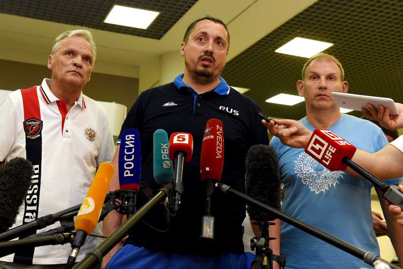 Shprygin (centre) answers journalists questions in Moscow on June 18, 2016, after being expelled from France.